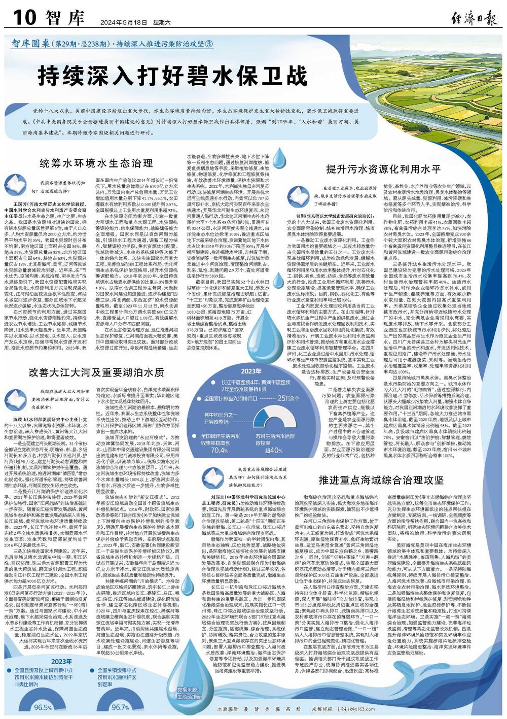 曾刚(华东师范大学城市发展研究院院长):党的十八大以来,我国工业废水资源化利用、农业面源污染控制、城乡生活污水治理、城市黑臭水体消除取得重要进展。