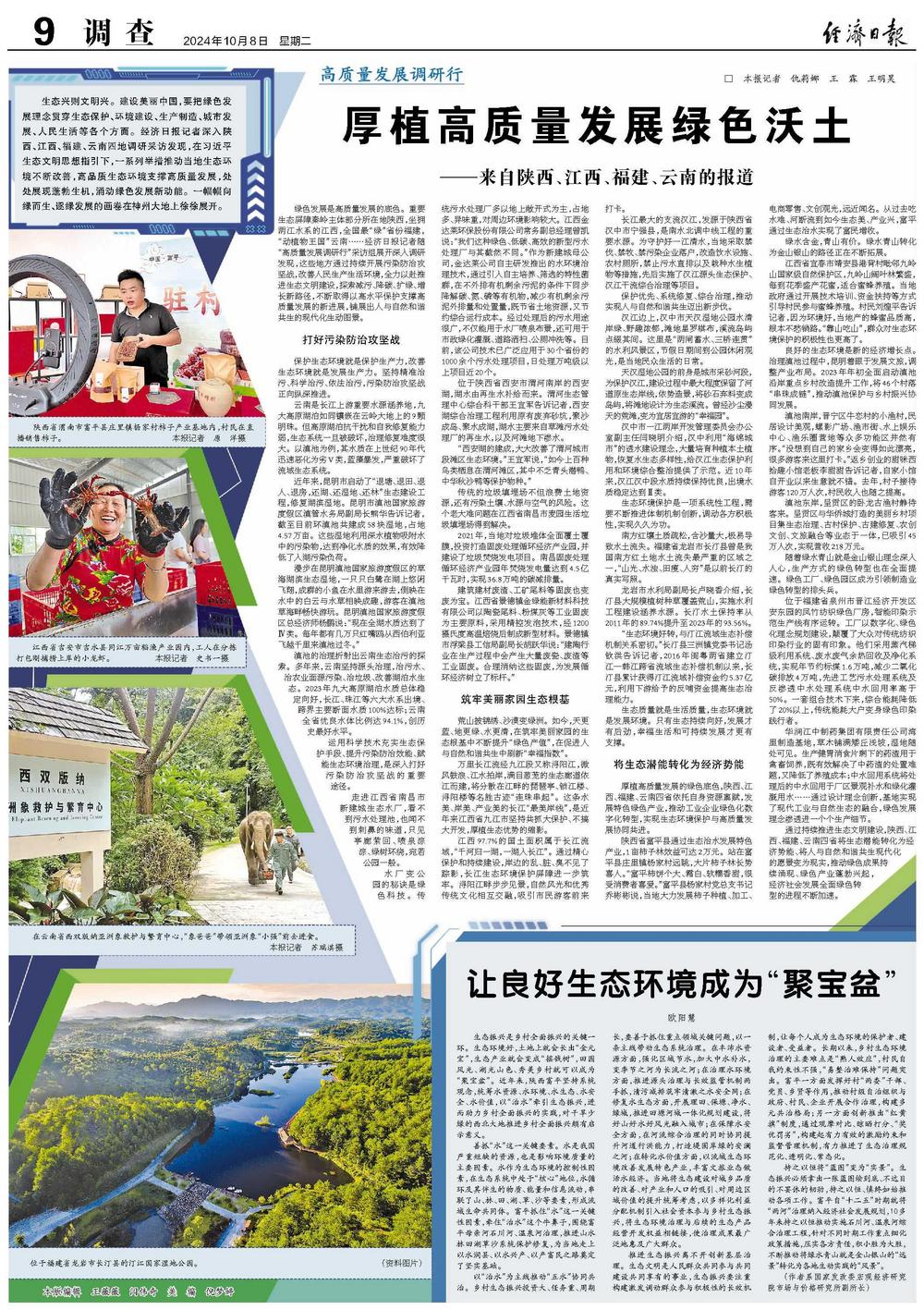 绿色发展是高质量发展的底色。重要生态屏障秦岭主体部分所在地陕西,坐拥两江水系的江西,全国最“绿”省份福建,“动植物王国”云南……经济日报记者随“高质量发展调研行”采访组展开深入调研发现,这些地方通过持续开展污染防治攻坚战,改善人民生产生活环境,全力以赴推进生态文明建设,探索减污、降碳、扩绿、增长新路径,不断取得以高水平保护支撑高质量发展的新进展,铺展出人与自然和谐共生的现代化生动图景。