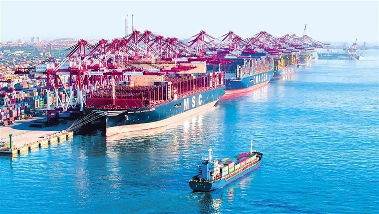12月4日,山东港口青岛港前湾集装箱码头,集装箱船有序停靠。近年来,青岛港综合实力不断增强,行业竞争力持续提升,货物吞吐量、集装箱数量等指标的世界排名连年提高。韩加君摄(中经视觉)