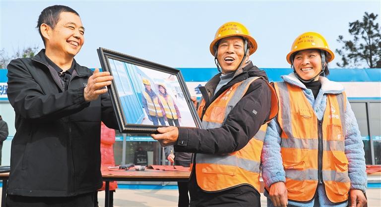 ▲1月4日,安徽省马鞍山市,巢马城际铁路站前五标工地,农民工收到摄影师为他们拍摄的工作照。