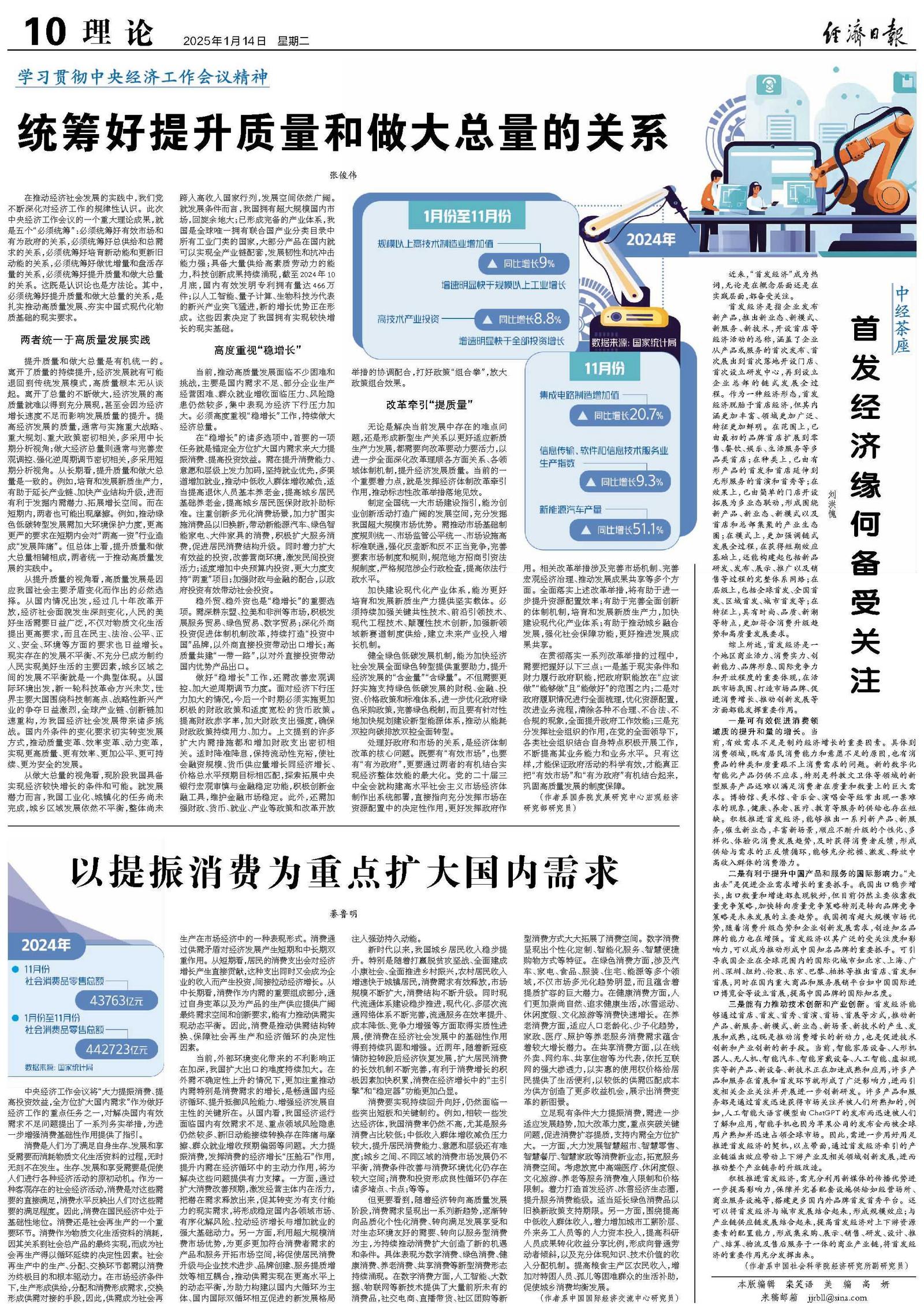一是可有效促进消费领域质的提升和量的增长。当前,有效需求不足是制约经济增长的重要因素。具体到消费领域,既有居民消费能力和意愿不足的原因,也有消费品的种类和质量跟不上消费需求的问题。新的数字化智能化产品仍供不应求,特别是科教文卫体等领域的新型服务产品还难以满足消费者在质量和数量上的巨大需求。博物馆、美术馆、音乐会、演唱会等经常出现一票难求的现象,健康、养老、医疗、教育等服务的供给也存在短缺。积极推进首发经济,能够推出一系列新产品、新服务,催生新业态,丰富新场景,顺应不断升级的个性化、多样化、体验化消费发展趋势,及时获得消费者反馈,形成供给与需求的正反馈循环,能够充分挖掘、激发、释放中高收入群体的消费潜力。