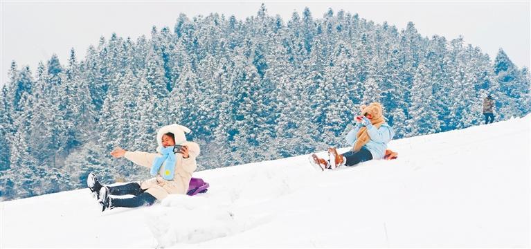 ▲1月9日,重庆市酉阳土家族苗族自治县菖蒲草原景区银装素裹,游客在雪地运动。