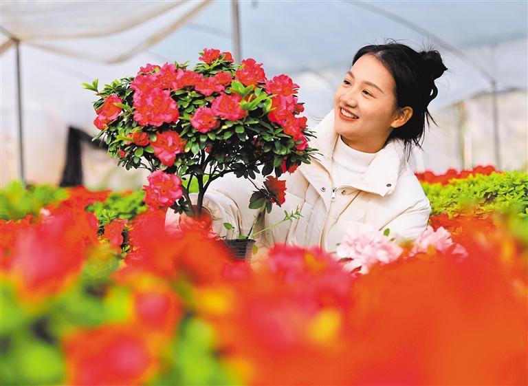 ◀1月15日,江西省吉安市峡江县水边镇现代农业示范园一花卉大棚,市民在挑选年宵花。