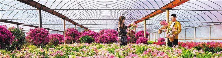 ▲1月10日,顾客在浙江省乐清市石帆街道花卉种植基地温室大棚挑选年宵花。