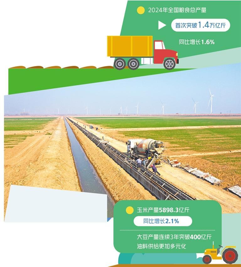 粮食产量是衡量一个国家农业发展水平、粮食稳定安全供给能力的重要指标。2024年粮食产量再上新台阶,全年全国粮食总产量14130亿斤,比2023年增加222亿斤,增长1.6%。粮食产量首次突破1.4万亿斤,中国碗装了更多中国粮,进一步增强了中国粮食安全底气,为推进乡村全面振兴、建设农业强国奠定了坚实基础,为巩固和增强经济回升向好态势、持续推动高质量发展提供了有力支撑,也为稳定全球粮食市场、维护世界粮食安全作出积极贡献。