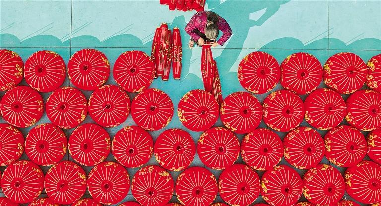 一月二十一日,江苏省海安市墩头镇毛庄村,工人在一家灯笼加工作坊整理晾晒制作完成的红灯笼,准备供应春节市场。