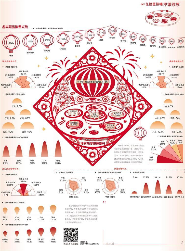 从线下消费看,年夜饭预订十分火热,各大酒店和餐饮品牌的年夜饭餐位往往数月前就被预订一空,甚至出现“一桌难求”的情况。同时,为了进一步促进餐饮消费,各地政府纷纷出台政策,如发放餐饮消费券等,这些政策激发了线下消费,推动年夜饭等春节消费增长。
