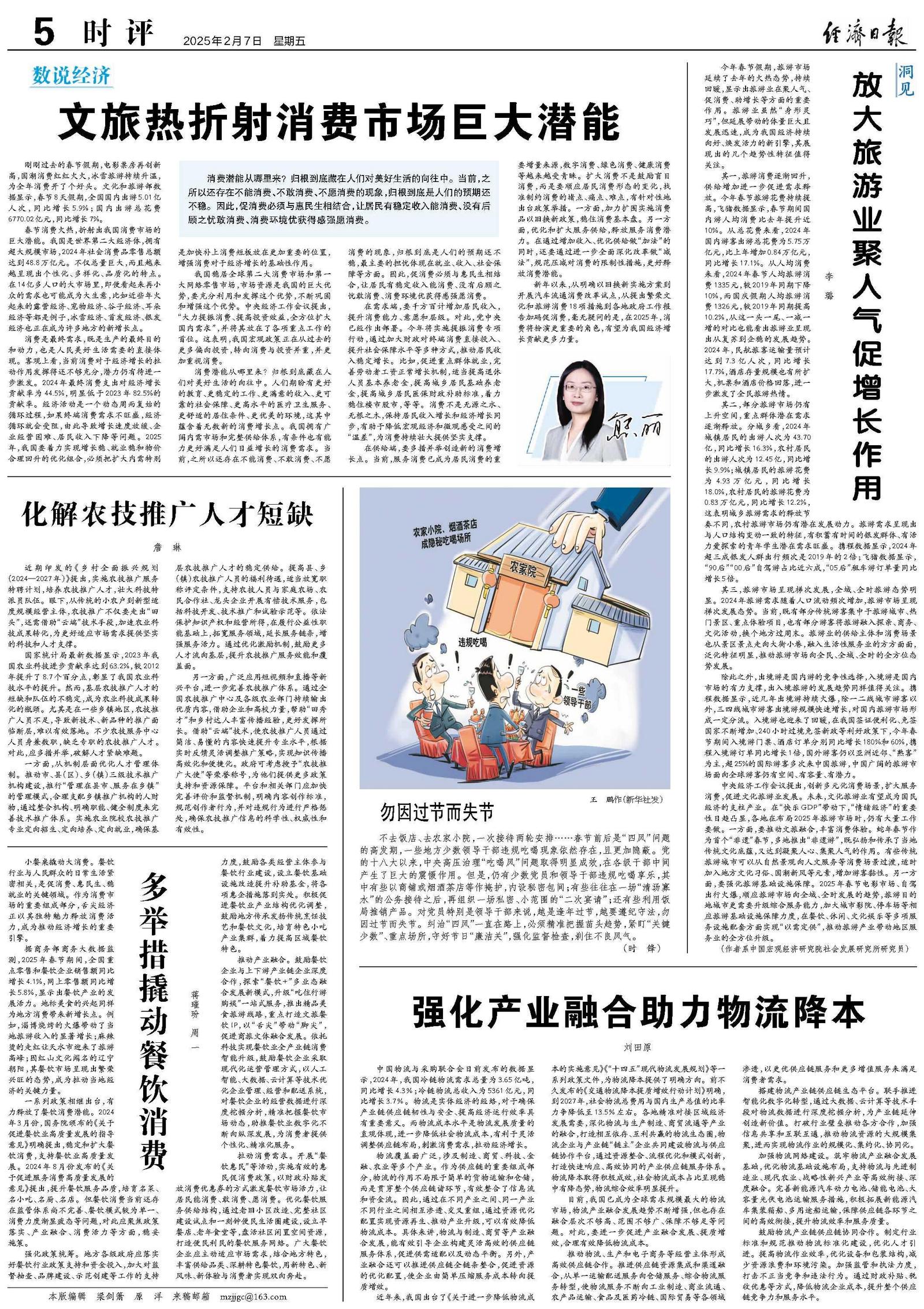 中央经济工作会议提出,创新多元化消费场景,扩大服务消费,促进文化旅游业发展。未来,文化旅游业有望成为国民经济的支柱产业。在“快乐GDP”带动下,“情绪经济”的重要性日趋凸显,各地在布局2025年旅游市场时,仍有大量工作要做。一方面,要推动文旅融合,丰富消费体验。蛇年春节作为首个“非遗”春节,多地推出“非遗游”,既弘扬和传承了当地传统文化底蕴,又达到凝聚人心、集聚人气的作用。有些传统旅游城市可以从自然景观向人文服务等消费场景过渡,适时加入地方文化习俗、国潮新风等元素,增加游客黏性。另一方面,要强化旅游基础设施保障。2025年春节电影市场、自驾出行火爆,顺应旅游市场向全域、全时发展的趋势,旅游目的地城市更需要升级综合服务能力,加大城市影院、停车场等相应旅游基础设施保障力度,在餐饮、休闲、文化娱乐等多项服务设施配套方面实现“以需定供”,推动旅游产业带动地区服务业的全方位升级。