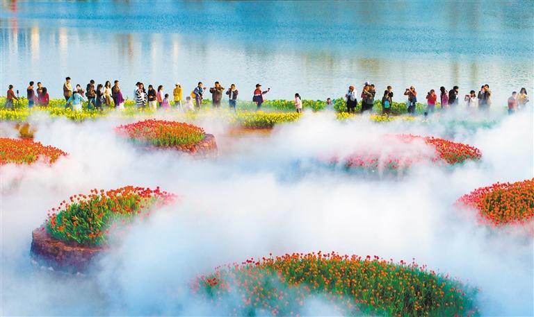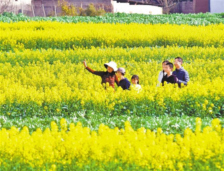 ▶2月3日,游客在云南巍山庙街镇古城村油菜花田游览拍照。