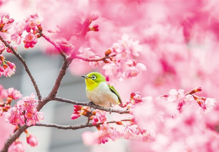 ▲2月5日,湖南蓝山舜水河畔的樱花绽放,鸟儿在花间嬉戏觅食。