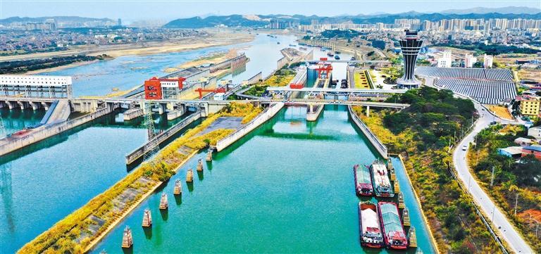2月9日,货船在广西梧州市长洲水利枢纽有序等待过船闸。新春伊始,随着西江主干道沿线各大企业复工复产,全力冲刺一季度开门红,过往长洲水利枢纽船闸的货船逐渐增多。