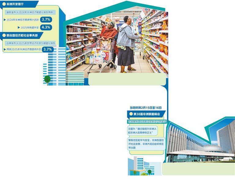 关于分析预测非洲经济形势及发展前景,国际金融组织和知名智库研究机构等对此持有较为一致的意见,即非洲经济既有发展机遇,又面临风险挑战。非洲开发银行发布的《2024年非洲经济展望》报告中预测,2024年非洲经济增速预计达到3.7%,2025年有望升至4.3%。此外,联合国经济和社会事务部也于近期发布《2025年世界经济形势与展望》报告,预测2025年非洲经济增速将由2024年的3.4%升至3.7%。