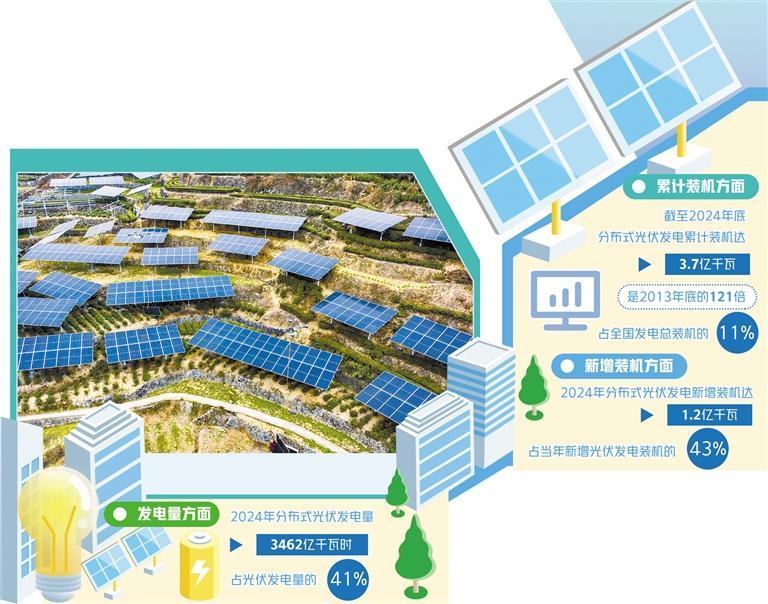 在国家政策推动下,分布式光伏发电建设规模实现从无到有、从小到大。累计装机方面,截至2024年底,分布式光伏发电累计装机达3.7亿千瓦,是2013年底的121倍,占全国发电总装机的11%。新增装机方面,2024年分布式光伏发电新增装机达1.2亿千瓦,占当年新增光伏发电装机的43%。发电量方面,2024年分布式光伏发电量3462亿千瓦时,占光伏发电量的41%。无论从累计装机、新增装机或是发电量看,分布式光伏发电已成能源转型重要力量。