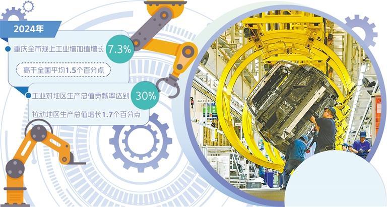 工业是重庆经济的大梁。过去一年,重庆工业发展交出了高分答卷:2024年,全市规上工业增加值增长7.3%,高于全国平均1.5个百分点,工业对地区生产总值贡献率达到30%,拉动地区生产总值增长1.7个百分点。