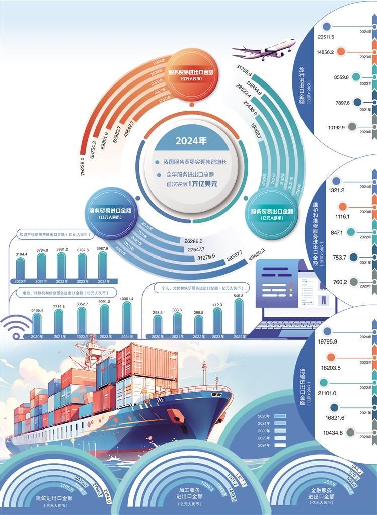 商务部数据显示,2024年我国服务进出口总额达7.5万亿元人民币,同比增长14.4%,服务贸易规模首次突破1万亿美元,再创历史新高。我国服务贸易实现了令人瞩目的快速增长,展示了经济发展的活力和韧性,背后是多个领域的协同发力。