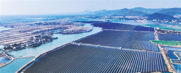 2月19日拍摄的安徽省芜湖市繁昌区平铺镇岱湖滩“渔光互补”光伏发电基地,一排排蓝色光伏板与山峦、田野、沟渠、村庄等相映成景。近年来,当地坚持绿色发展理念,大力发展光伏发电等绿色清洁能源项目,助力乡村振兴。鲁君元摄(中经视觉)
