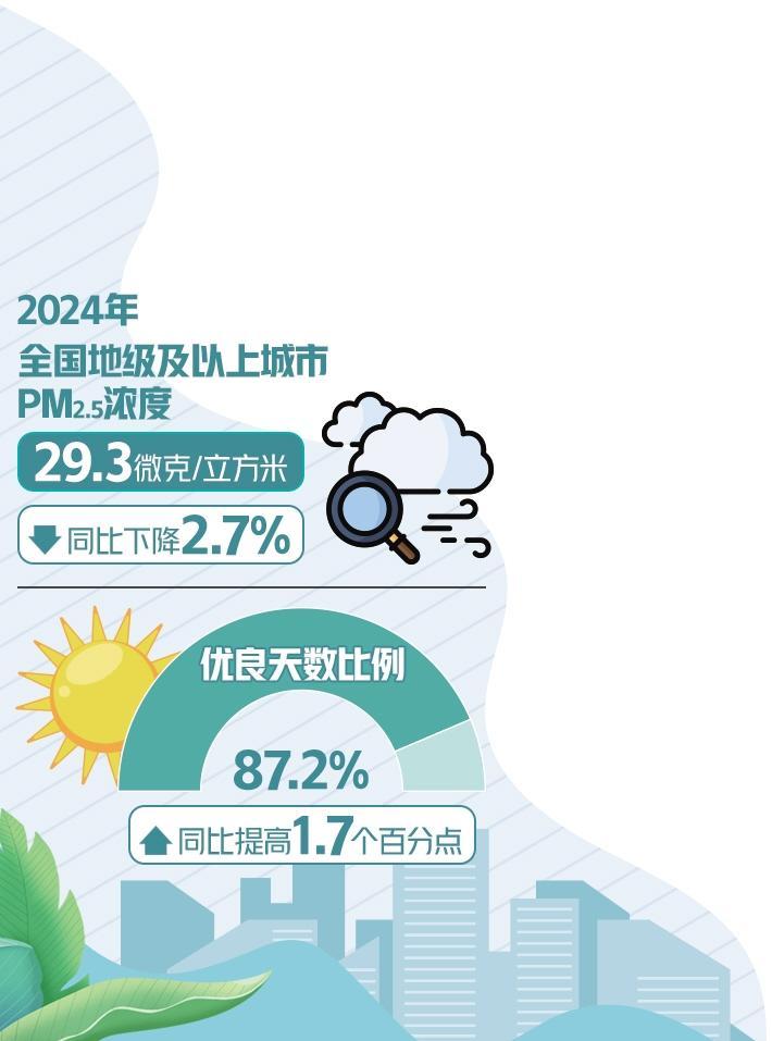 “2024年,全国环境空气总体改善。”李天威指出,空气质量改善幅度显著。2024年,全国地级及以上城市PM_2.5浓度为29.3微克/立方米,同比下降2.7%;优良天数比例为87.2%,同比提高1.7个百分点;重度及以上污染天数比率为0.9%,同比下降0.7个百分点,3项约束性指标均优于年度目标。