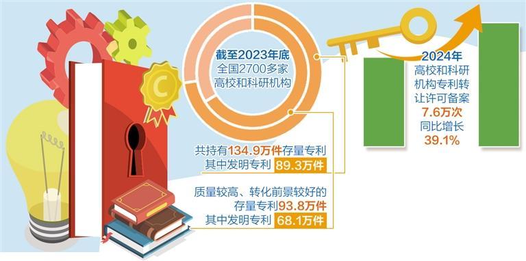 近期,国家知识产权局首次完成全国高校和科研机构的存量专利大盘点。截至2023年底,全国2700多家高校和科研机构共持有134.9万件存量专利,其中发明专利89.3万件;2024年新授权发明专利18.9万件。在这庞大的专利库中,有的专利已在产业界大放异彩,有的仍“躺”在纸面上“沉睡”未醒。如何让这些“沉睡”专利焕发新生,转化为驱动经济发展的创新力量?
