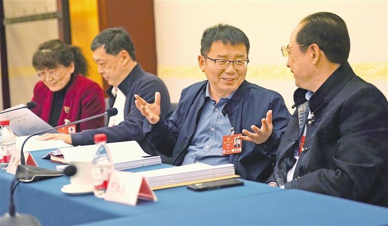 3月9日下午,全国政协十四届三次会议在委员驻地举行小组会议。这是会议开始前,农业界严建兵委员(右二)和其他委员交流讨论。本报记者 赵 晶摄