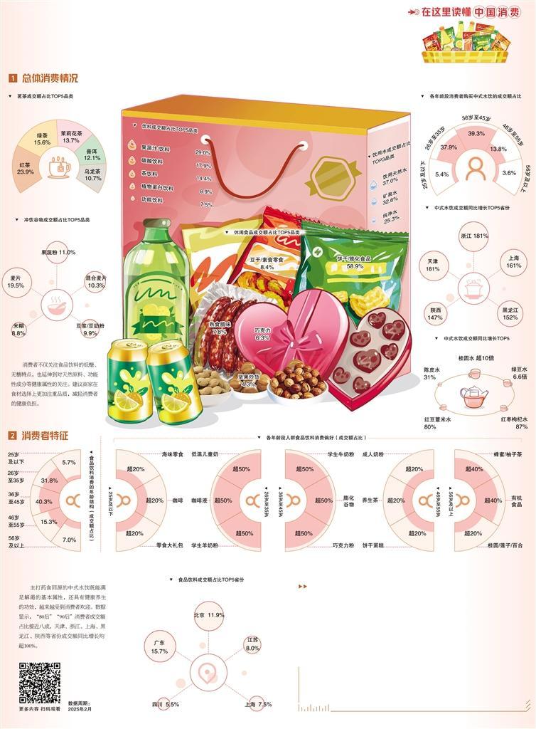 不断发展壮大的食品饮料行业为消费者提供了更多元、更优质的产品和消费体验。休闲食品中,饼干/膨化食品、豆干/素食零食、熟食腊味成为成交额占比位列前三的产品。饮料品类中,果蔬汁、碳酸饮料、茶饮料是主流选择,成交额占比居前三位。麦片、果蔬粉、混合麦片最受消费者欢迎,成为冲饮谷物食品中的营养担当。茗茶品类中,红茶、绿茶和茉莉花茶占据了一半多的成交额。