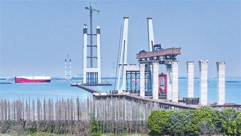 3月26日,江苏省张家港市张靖皋长江大桥南航道桥建设现场,建设者们正抓紧施工。目前,张靖皋长江大桥南主塔高度达到208米,其他工程节点有序推进,施工现场一派繁忙景象。施柏荣摄(中经视觉)