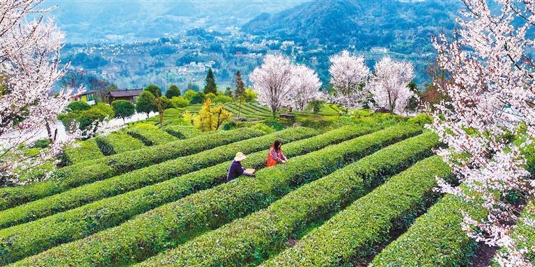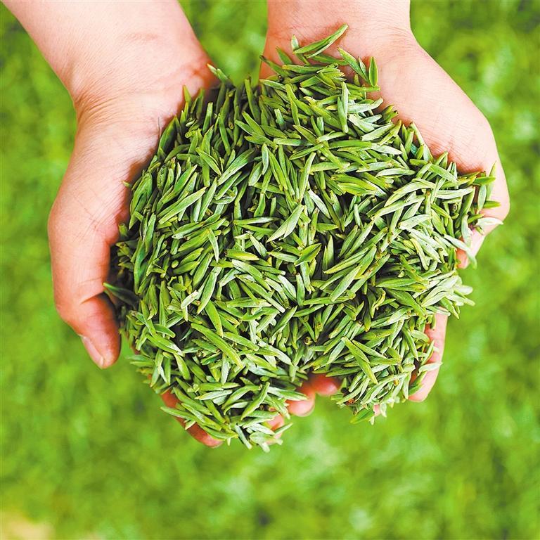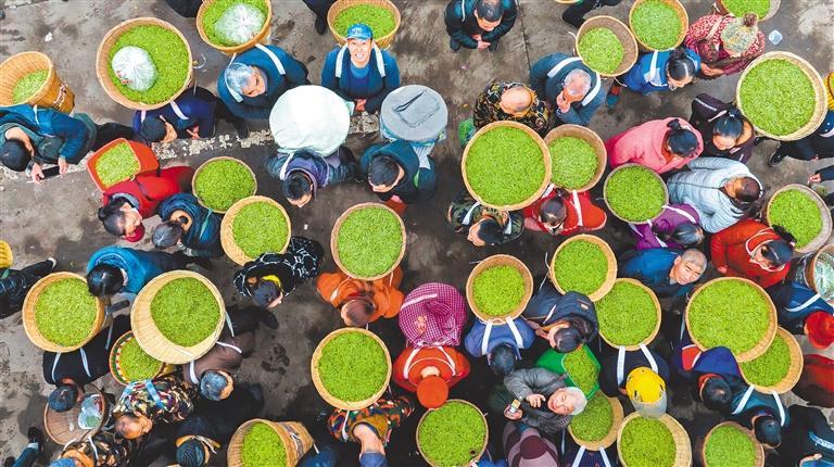 ◀3月21日,村民在重庆黔江区蓬东乡尖山村茶叶基地展示采摘的明前茶。