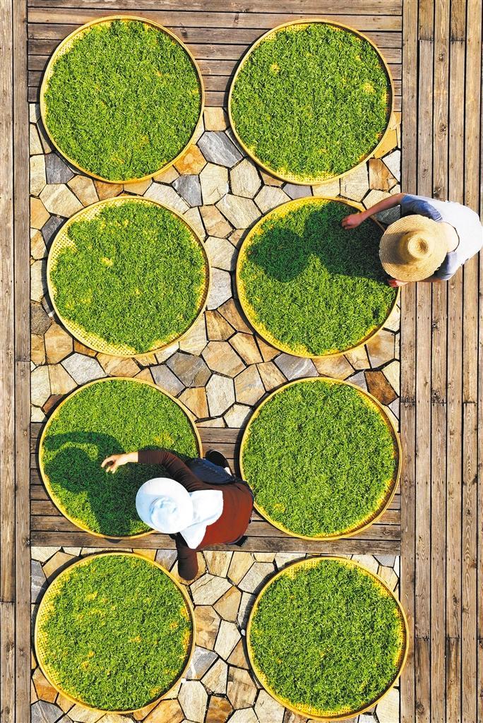 ▶3月25日,湖南衡阳市衡东县白莲镇小初茶场,村民在摊晒春茶。
