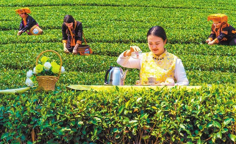 ▼3月22日,村民在广西金秀瑶族自治县大樟乡三古村2025年全国春季“村晚”示范展示活动上展示茶艺。