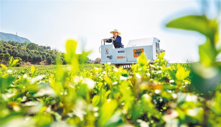 ▶3月25日,浙江金华市武义县王宅镇的连片茶田,技术人员在调试机械化采茶机,为接下来武义绿茶的全面开采做好准备。
