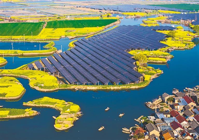 3月26日,江苏省泰州市海陵区下溪村渔光互补光伏发电项目被美丽的春光包裹。近年来,海陵区华港镇有序发展渔光互补和风力发电等清洁能源产业,助推经济绿色低碳发展。