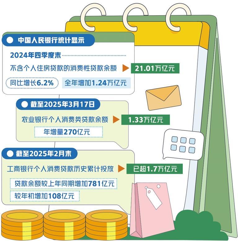 “今年以来,工商银行调动全行资源开展提振消费专项行动,持续加大信贷投放力度。截至2025年2月末,个人消费贷款历史累计投放已超1.7万亿元,贷款余额较上年同期增加781亿元,较年初增加108亿元。”中国工商银行个人信贷业务部相关负责人说,接下来,将深入研究不同消费者的实际需求、行为特征以及变化趋势,以具体的消费场景为切入口,分类施策、协同联动,借助数字化、智能化技术手段,持续增加消费信贷供给,提升金融服务质量。