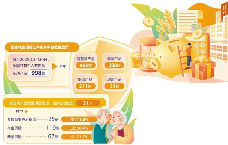 近年来,我国养老金融产品不断推陈出新,尤其是自2022年个人养老金制度正式实施以来,各类金融机构纷纷布局个人养老投资产品,以抢占市场先机。国家社会保险公共服务平台数据显示,截至2025年3月30日,全国共有个人养老金专项产品998款,其中储蓄类产品466款、基金产品288款、保险产品211款、理财产品33款。保险类产品数量明显增加,目前占比达到21%。其中,专属商业养老保险25款,占比11.8%;年金保险119款,占比56.4%;两全保险67款,占比31.7%,市场选择更加多样化。