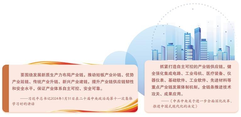 增强韧性,确保供应链安全稳定。全面梳理掌握供应链情况,从关键性、脆弱性等维度系统评估研判风险,建设可控、多元的供应链安全体系。提升关键领域和薄弱环节韧性,发挥新型举国体制优势,集成国家战略科技力量,推动供应链关键核心技术攻关,建设国家战略腹地和关键产业备份,在重点行业实施“备链”计划,增强供应链发展的战略纵深和安全水平。完善应急供应链体系,推动建立政府、企业、机构等多主体参与、发挥各自优势的应急机制,健全应急供应链分级响应和联防联控机制,加快完善国家储备体系,优化关键物资生产能力与区域布局,确保应急资源关键时刻拿得出、调得快、用得上。