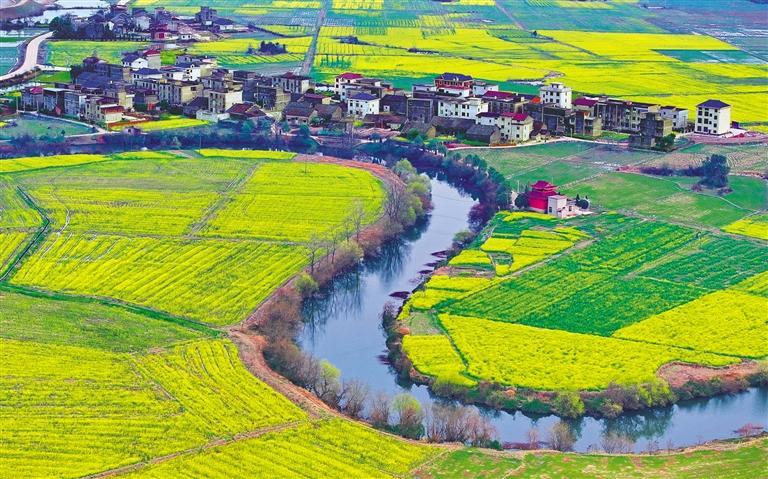 三月三十一日,江西省抚州市临川区桐源乡池溪村,农田与河流相映成景。近年来,当地扎实推进山水林田湖生态保护和治理工作,实现水生态环境修复与改善。朱海鹏摄(中经视觉)