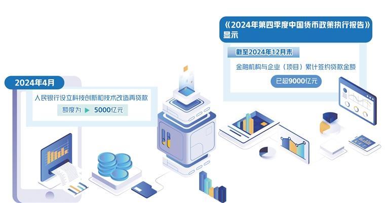 作为结构性货币政策工具,科技创新和技术改造再贷款将进一步优化,扩大规模、降低利率、扩大支持范围。2024年4月,人民银行设立科技创新和技术改造再贷款,额度为5000亿元,激励、引导金融机构向科技型中小企业以及重点领域的数字化、智能化、高端化、绿色化技术改造和设备更新项目提供信贷支持。近期发布的《2024年第四季度中国货币政策执行报告》显示,截至2024年12月末,金融机构与企业(项目)累计签约贷款金额已超9000亿元,有力支持了科技型中小企业首贷、重点领域技术改造和设备更新项目。