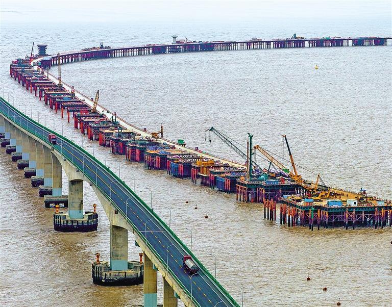 3月31日,浙江省临海市头门港铁路跨海特大桥建设现场,工人在抓紧施工作业。头门港铁路跨海特大桥全长12公里,工程完成后,将进一步完善台州港口集疏运体系,激活金台铁路货运运能。潘侃俊摄(中经视觉)
