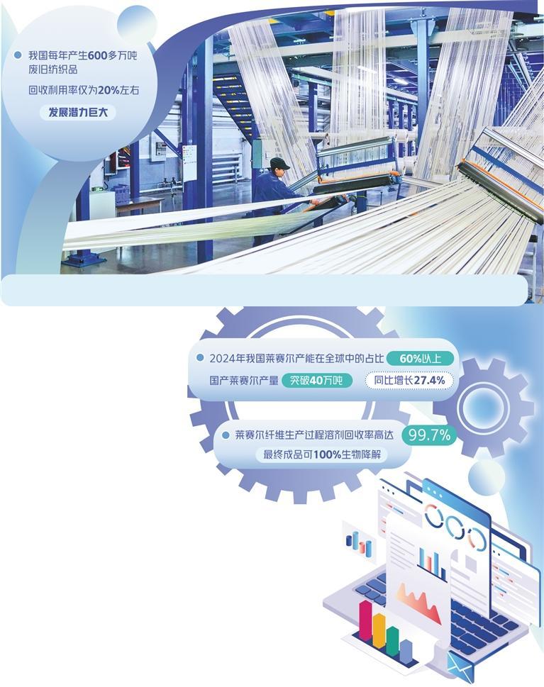 绿色环保观念深入人心,莱赛尔逐步成为市场新宠。“近年来,莱赛尔纤维发展迅速,应用领域不断拓展。”陈新伟说,2024年我国莱赛尔产能在全球中的占比达到60%以上,国产莱赛尔产量突破40万吨,同比增长27.4%,正从“小而精”向主流化纤品种过渡。
