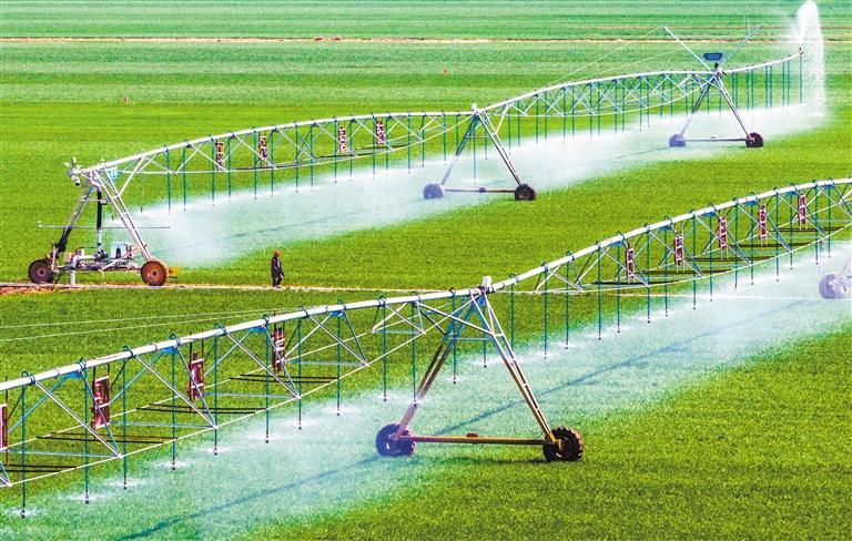 ▲3月30日,山西省运城市芮城县东垆乡远鹏家庭智慧农场,农民利用现代化的桁架淋灌机对冬小麦进行春浇。