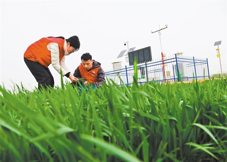 ▼3月27日,山东省聊城市东昌府区侯营镇老鸦陈村高标准农田,农技人员在查看小麦苗情和土壤墒情,核实智能农业监测设备监测运行情况。