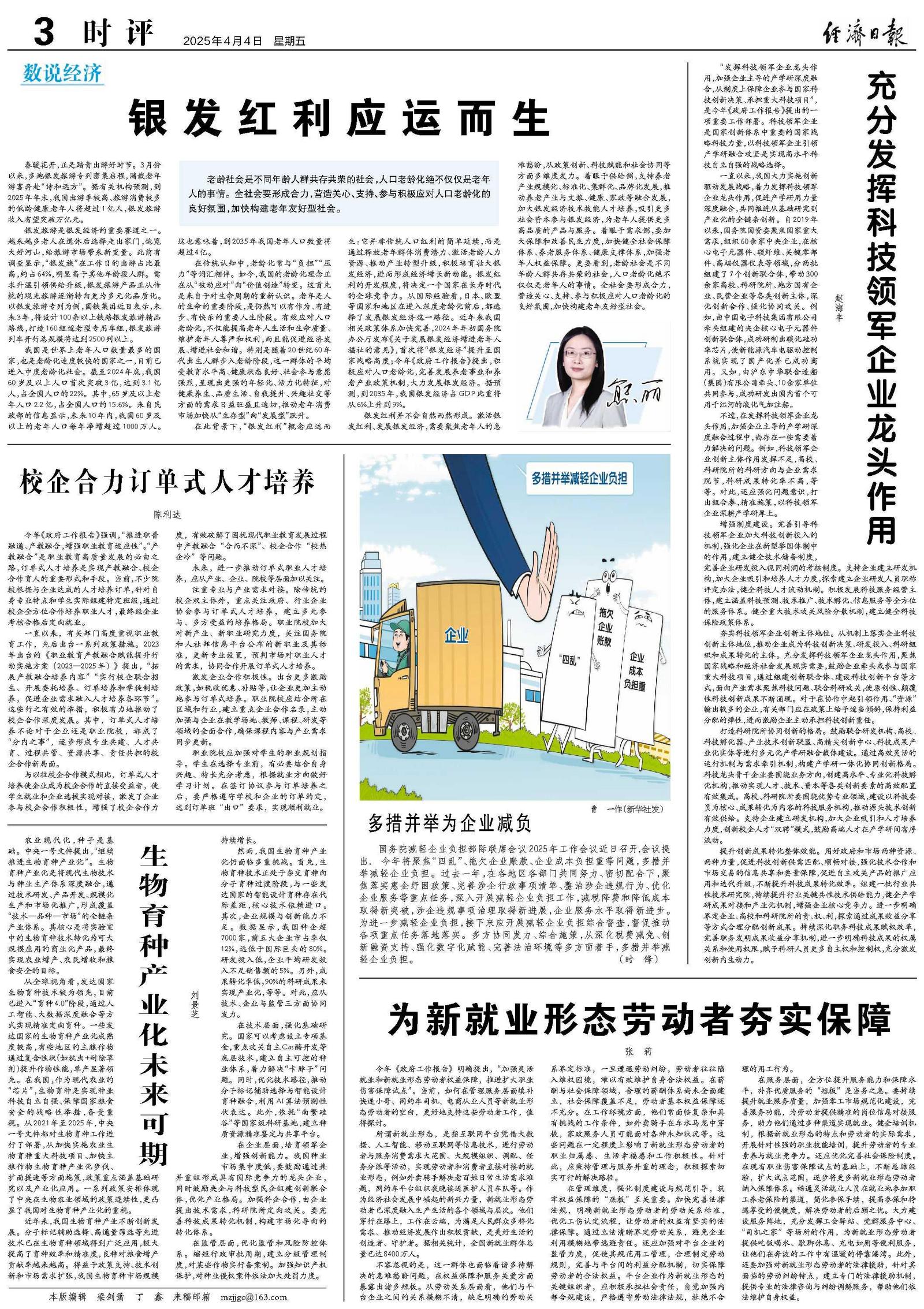 银发旅游是银发经济的重要赛道之一。越来越多老人在退休后选择走出家门,饱览大好河山,给旅游市场带来新变量。此前有调查显示,“银发族”在工作日的出游占比最高,约占64%,明显高于其他年龄段人群。需求升温引领供给升级,银发旅游产品正从传统的观光旅游逐渐转向更为多元化品质化。以银发旅游专列为例,国铁集团近日表示,未来3年,将设计100条以上铁路银发旅游精品路线,打造160组适老型专用车组,银发旅游列车开行总规模将达到2500列以上。