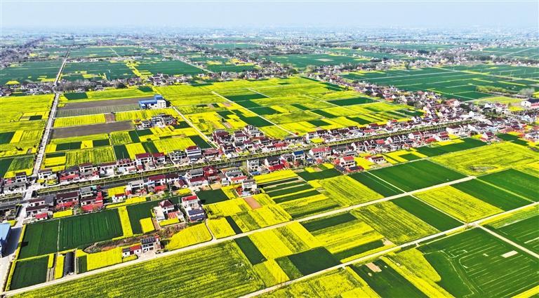 近日,江苏省海安市雅周镇东夏村机械化移栽的千亩油菜花次第绽放,与村庄、公路、河道等相映生辉。近年来,海安市因地制宜推广“粮油”轮作模式,降本增效开展油菜规模化种植,促进农业提质、农民增收。