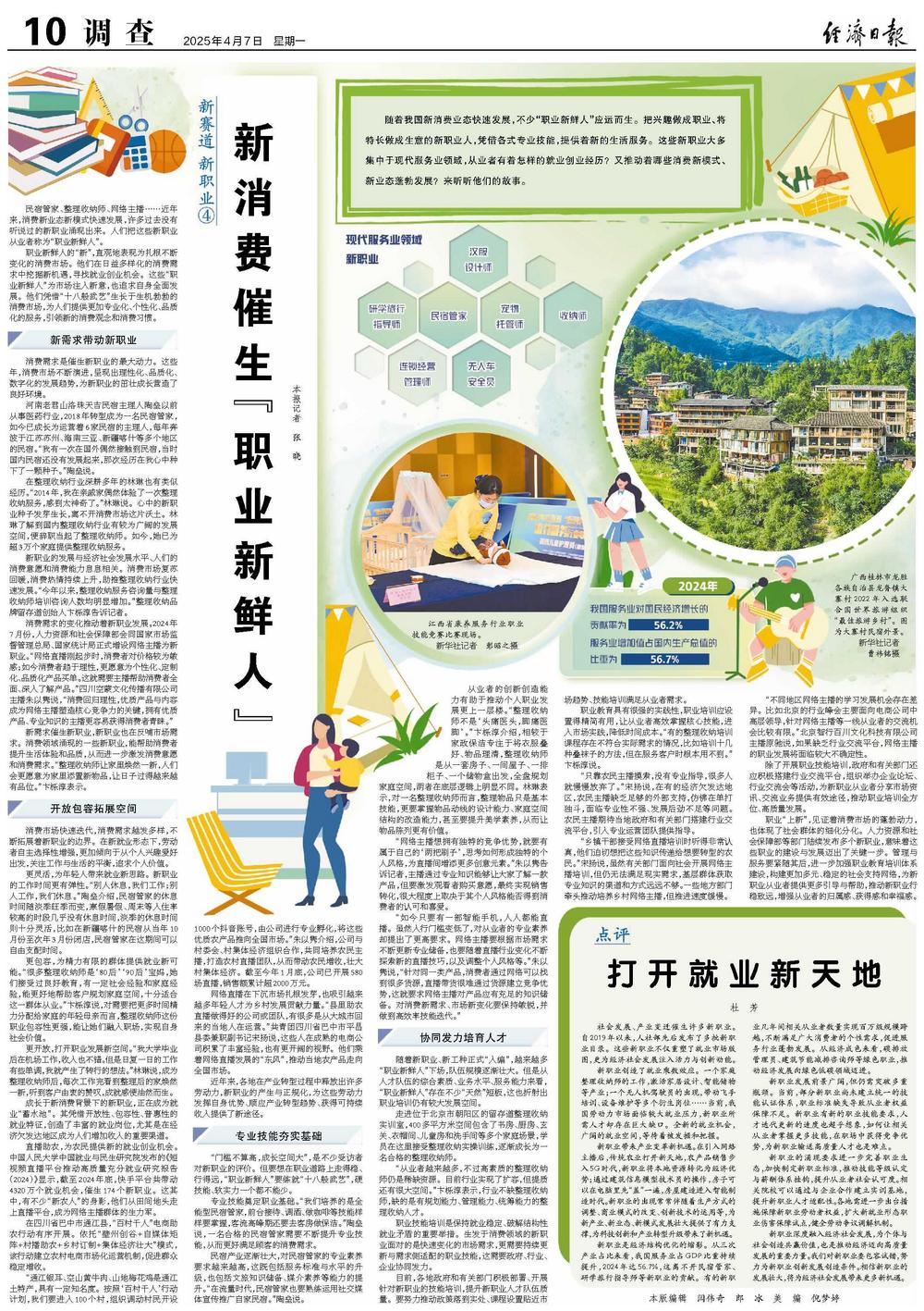 民宿管家、整理收纳师、网络主播……近年来,消费新业态新模式快速发展,许多过去没有听说过的新职业涌现出来。人们把这些新职业从业者称为“职业新鲜人”。