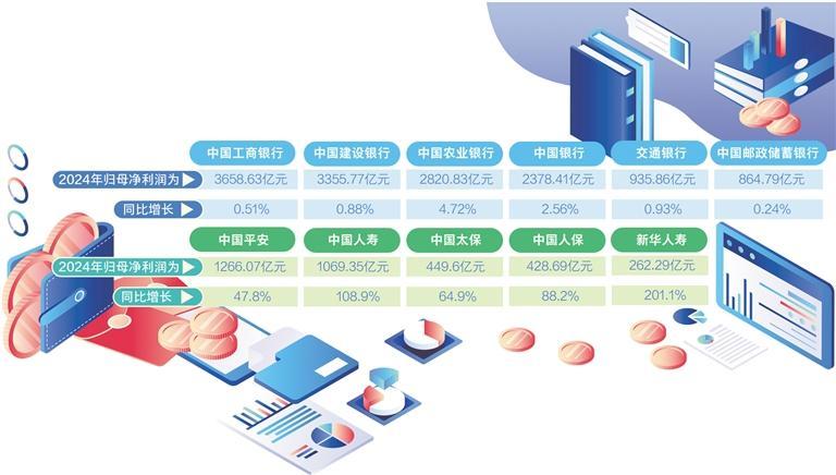 近期,各家上市金融公司陆续披露了2024年业绩报告。归母净利润是衡量上市公司盈利能力的关键财务指标。银行方面,以6家国有大型商业银行为例,中国工商银行、中国建设银行、中国农业银行、中国银行、交通银行、中国邮政储蓄银行2024年归母净利润分别为3658.63亿元、3355.77亿元、2820.83亿元、2378.41亿元、935.86亿元、864.79亿元,同比分别增长0.51%、0.88%、4.72%、2.56%、0.93%、0.24%。