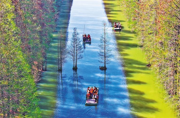 4月6日,江苏省淮安市金湖县银涂镇水上森林公园,游客乘坐竹筏穿行在杉林水间。清明假期,金湖县平湖花海、水上森林公园、十里果林等景区成为长三角游客踏青的热门目的地,各景区游客如织,以“农旅+”的创新模式为乡村振兴注入强劲动能。