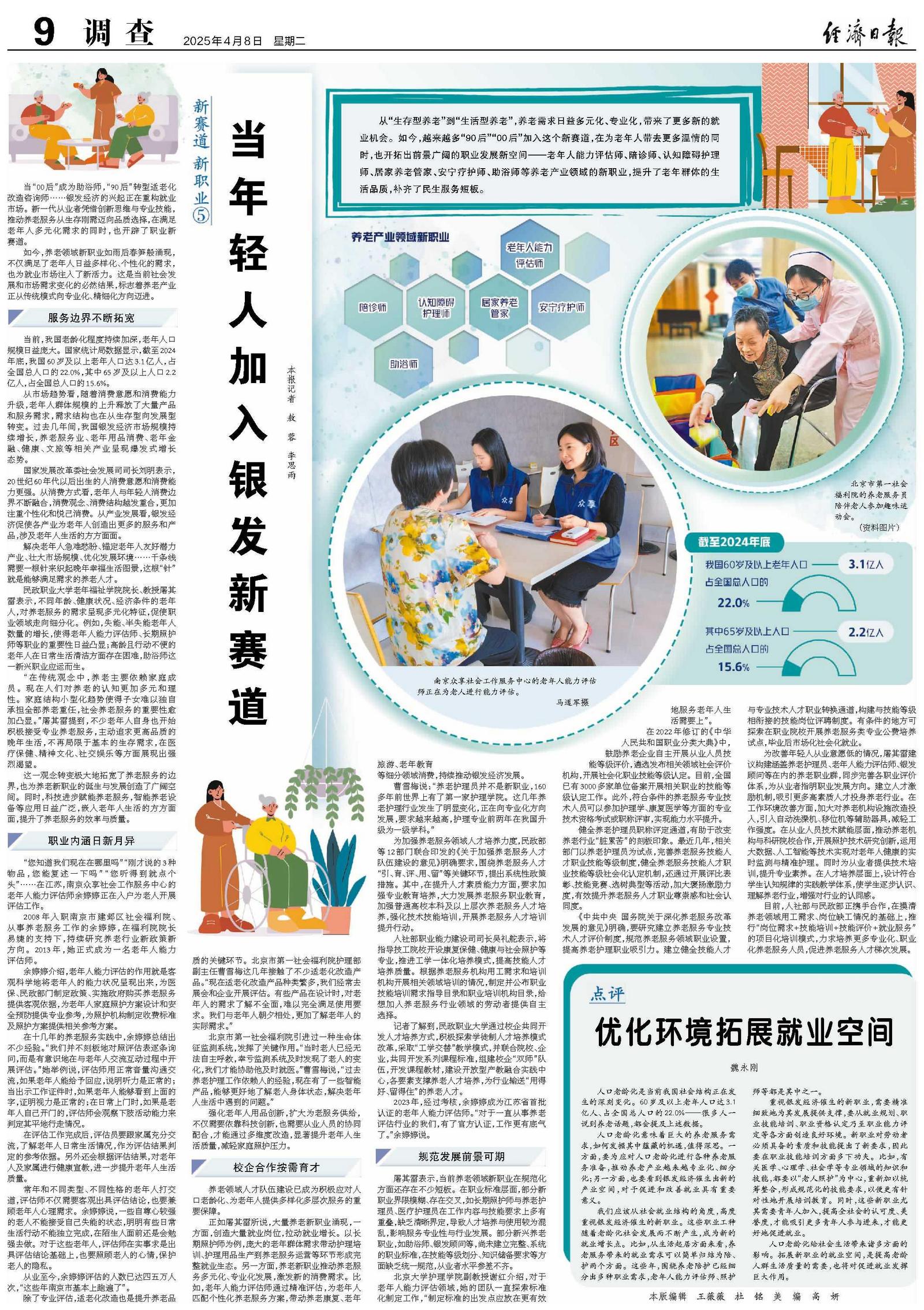 从“生存型养老”到“生活型养老”,养老需求日益多元化、专业化,带来了更多新的就业机会。如今,越来越多“90后”“00后”加入这个新赛道,在为老年人带去更多温情的同时,也开拓出前景广阔的职业发展新空间——老年人能力评估师、陪诊师、认知障碍护理师、居家养老管家、安宁疗护师、助浴师等养老产业领域的新职业,提升了老年群体的生活品质,补齐了民生服务短板。