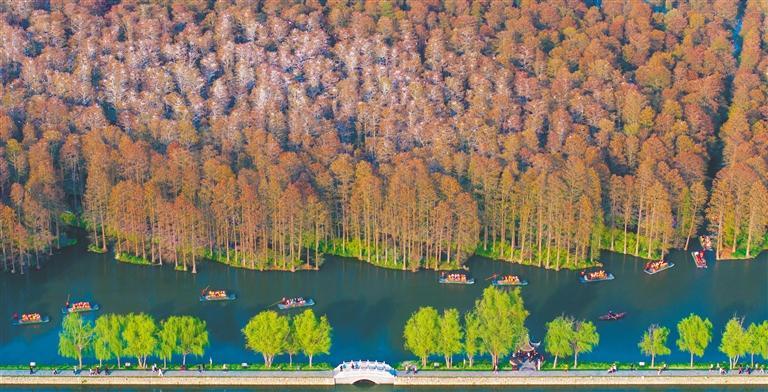 ▼4月5日,江苏省兴化市李中水上森林公园,游客泛舟水上。