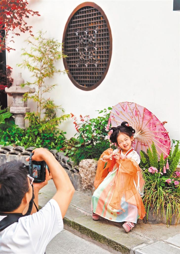 ◀4月5日,小朋友在四川省南充市阆中古城拍照打卡,体验汉服魅力,乐享假日时光。