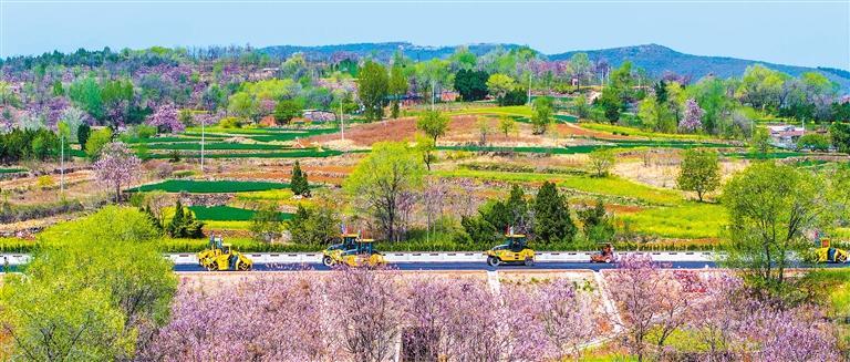 4月7日,河南省洛阳市新安县的济新高速公路施工现场,大型机械正在进行路面沥青摊铺作业。该项目建成后,将进一步完善豫晋高速公路网,带动沿线经济发展。张怡熙摄(中经视觉)