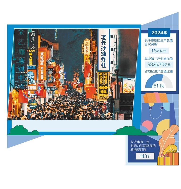 新消费品牌向阳生长,激发市场经济发展活力。长沙市统计局数据显示,2024年,长沙地区生产总值首次突破1.5万亿元,其中第三产业增加值9326.70亿元,占GDP比重达61.1%;社会消费品零售总额5797.71亿元、同比增长4.2%。