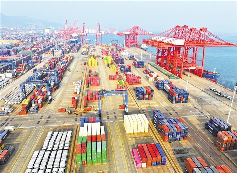 4月8日,江苏省连云港港集装箱码头,货轮在装卸集装箱。今年一季度,连云港港深入实施“片区运转+网格开发”,实现货物吞吐量同比增长9.07%、集装箱量同比增长9.08%,吞吐量和集装箱量实现双增长。王 春摄(中经视觉)